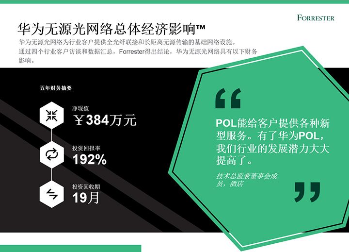 2022年上半年,華為委托權威咨詢公司Forrester進行了《華為無源光網絡總體經濟影響™》研究。在本研究中,Forrester通過客戶訪談,以專有方法論分析部署華為無源光網絡(Passive optical LAN,POL)方案對企業帶來的經濟影響。研究結果顯示,企業使用華為POL五年投資回報率達192%,投資回報周期為19個月。