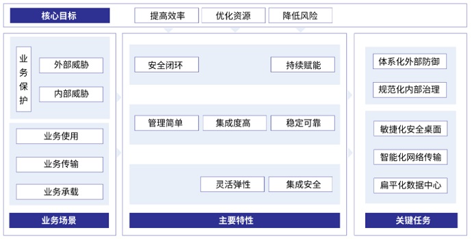 數字化轉型的核心目標是“提高效率、優化資源、降低風險”,業務場景包含“業務保護、業務使用、業務傳輸、業務承載”,將核心目標與業務場景相結合,可明確數字化轉型關鍵任務為“體系化外部防御、規范化內部治理、敏捷化安全桌面、智能化網絡傳輸、扁平化數據中心”。企業可進一步結合自身的發展情況,從最為緊迫的關鍵任務入手,一步步走好轉型之路。